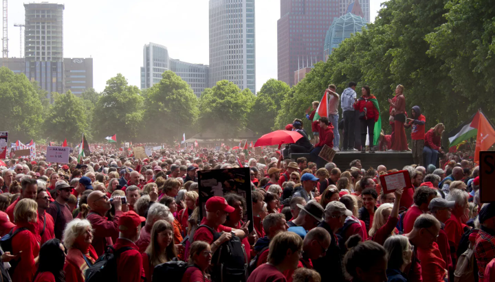 Mijëra qytetarë marshuan në Hagë të dielën, duke kërkuar që qeveria holandeze të ndalojë mbështetjen ndaj Izraelit për shkak të veprimeve të tij në Gaza. Organizatorët e përshkruan protestën si më të madhën në dy dekadat e fundit, me mbi 100,000 pjesëmarrës, sipas Amnesty International dhe organizatave të tjera humanitare.