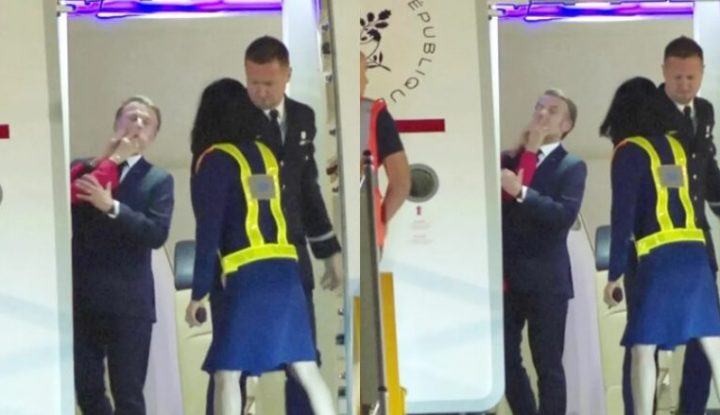 Në momentin kur dera e aeroplanit u hap, dora e Brigitte ‘godet’ fytyrën e presidentit francez.