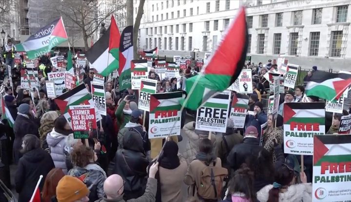 Qindra protestues u mblodhën në Londër përballë zyrës së kryeministrit në Downing Street, duke mbajtur flamuj palestinezë dhe duke thirrur “Palestina e lirë”.