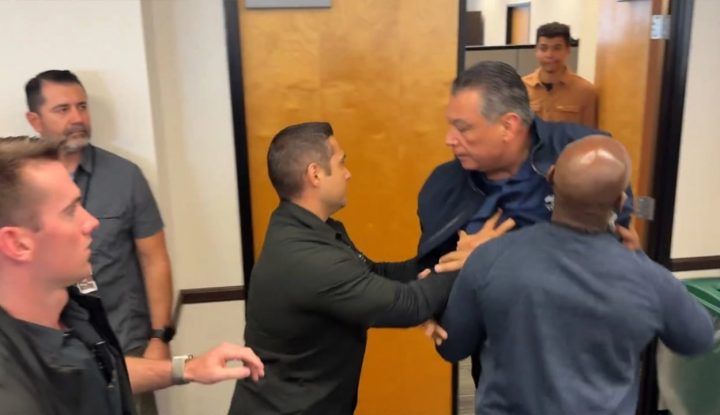 “Ai u përpoq t’i bënte një pyetje sekretares dhe u largua me forcë nga agjentët federalë, u detyrua të shtrihej përtokë dhe iu vunë prangat”, tha një zëdhënës i senatorit demokrat.